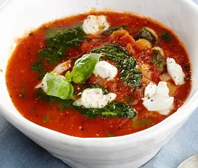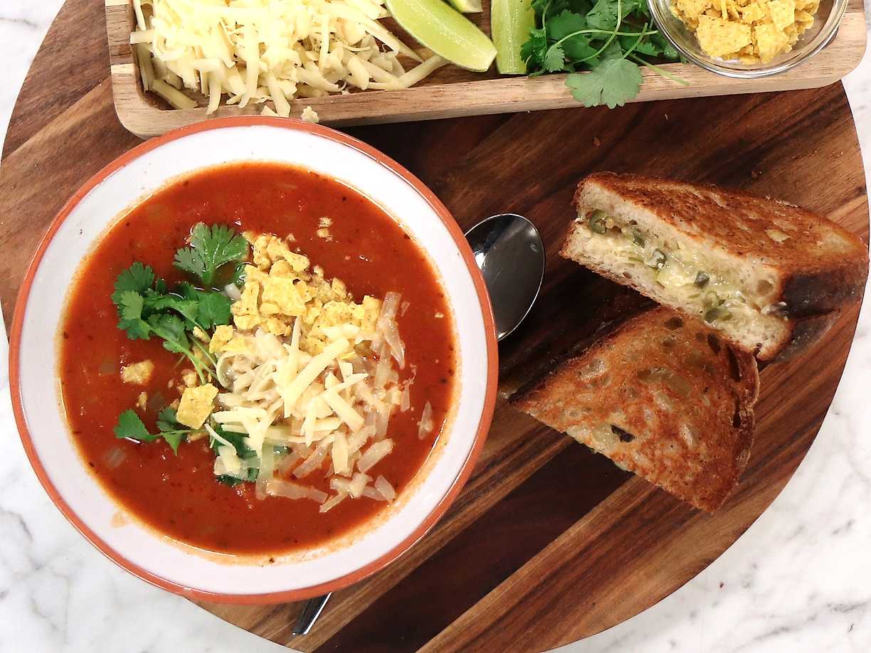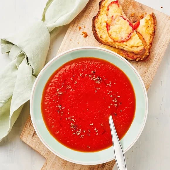Tomatsoppa med krispig pesto- och mozzarellatoast