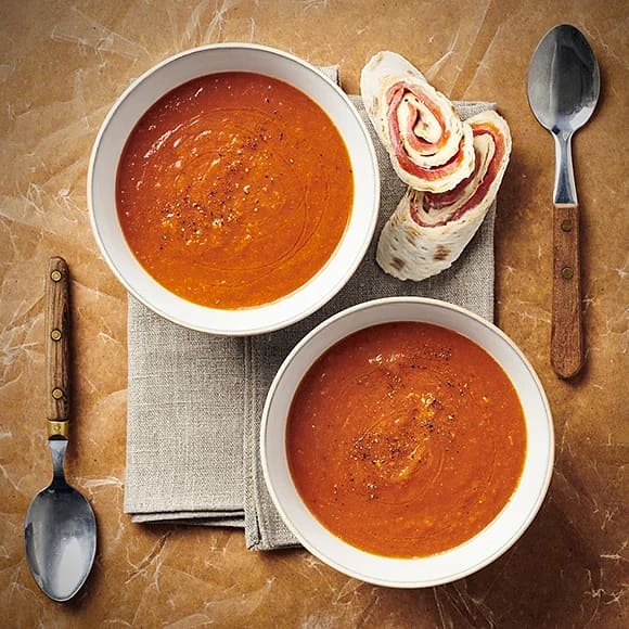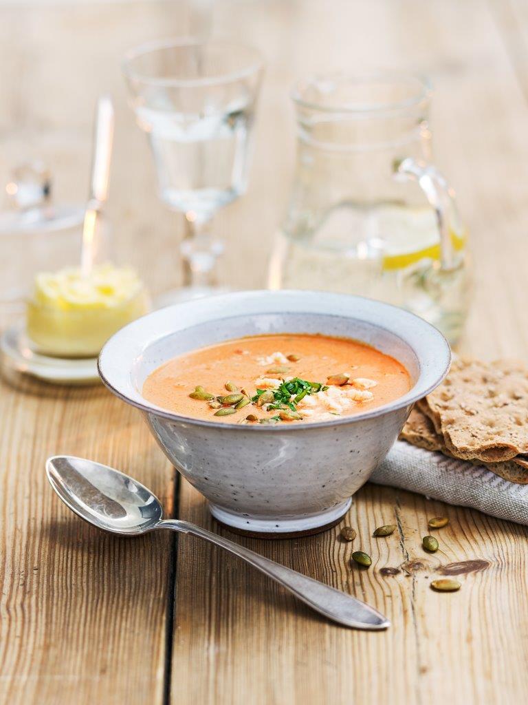 Tomatsoppa med tunnbrödsrulle med hummus och paprika
