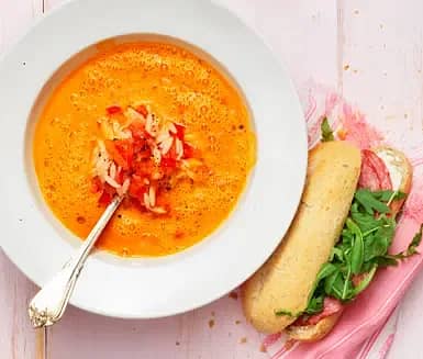 Tomatsoppa med ugnsgrillad baguette med pesto, brieost och skinka