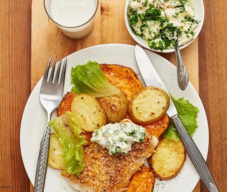 Örtbakad torsk med rotsakspuré och brynt smör