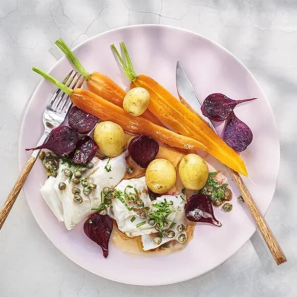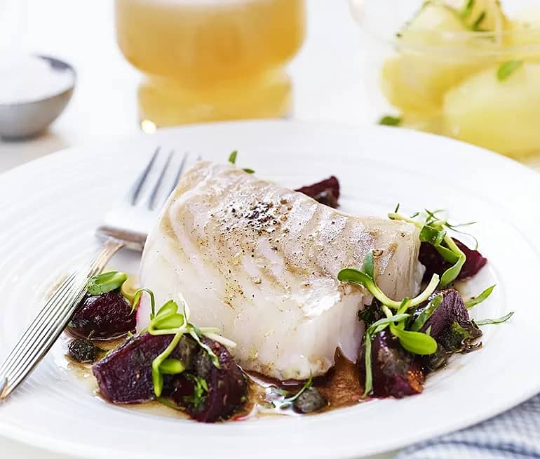 Ugnsbakad torsk med rödbetor, kapris och brynt smör