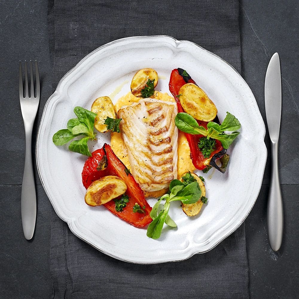 Torsk med sötpotatisaioli och rostad paprika