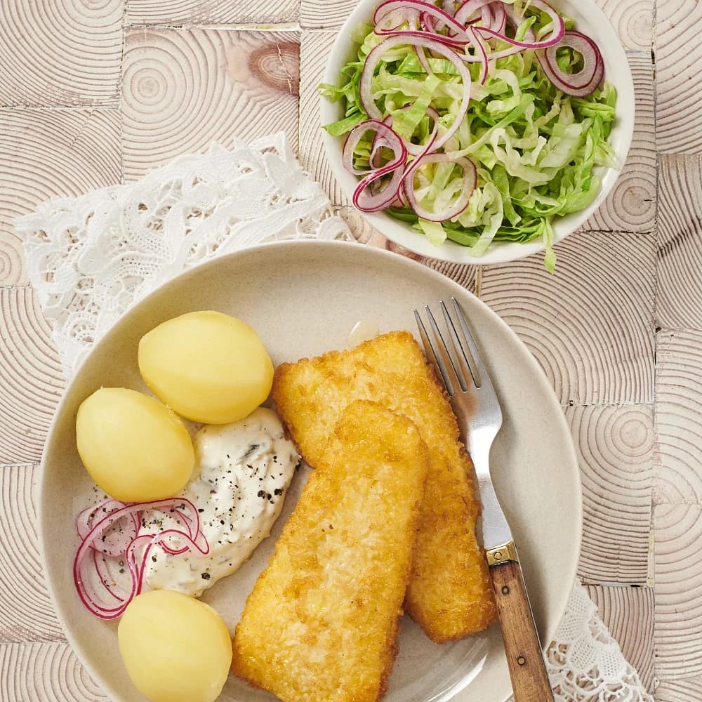 Gustavs panerade torsk med kall äggsås, kokt potatis och blomkål