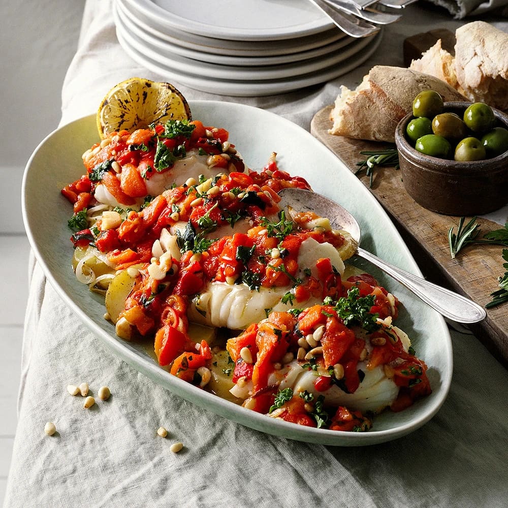 Torsk med rostad paprika, vitlök och chili