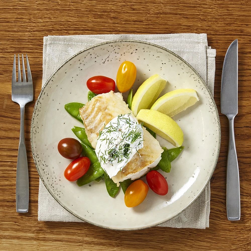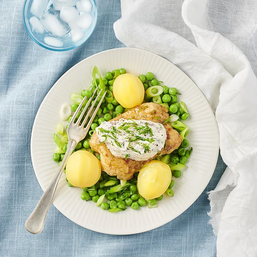 Stekt torsk med dillmajonnäs och sockerärtor