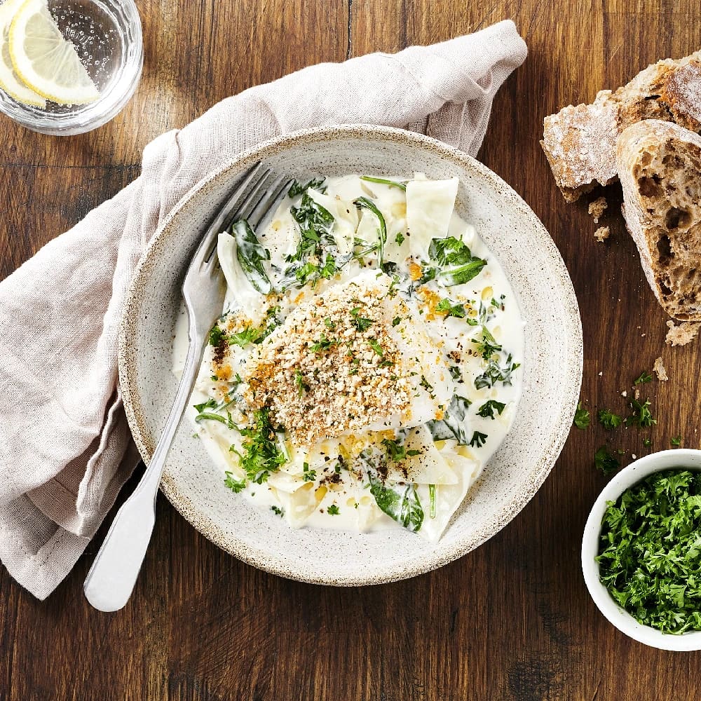 Krämig vitkål med pankobakad torsk