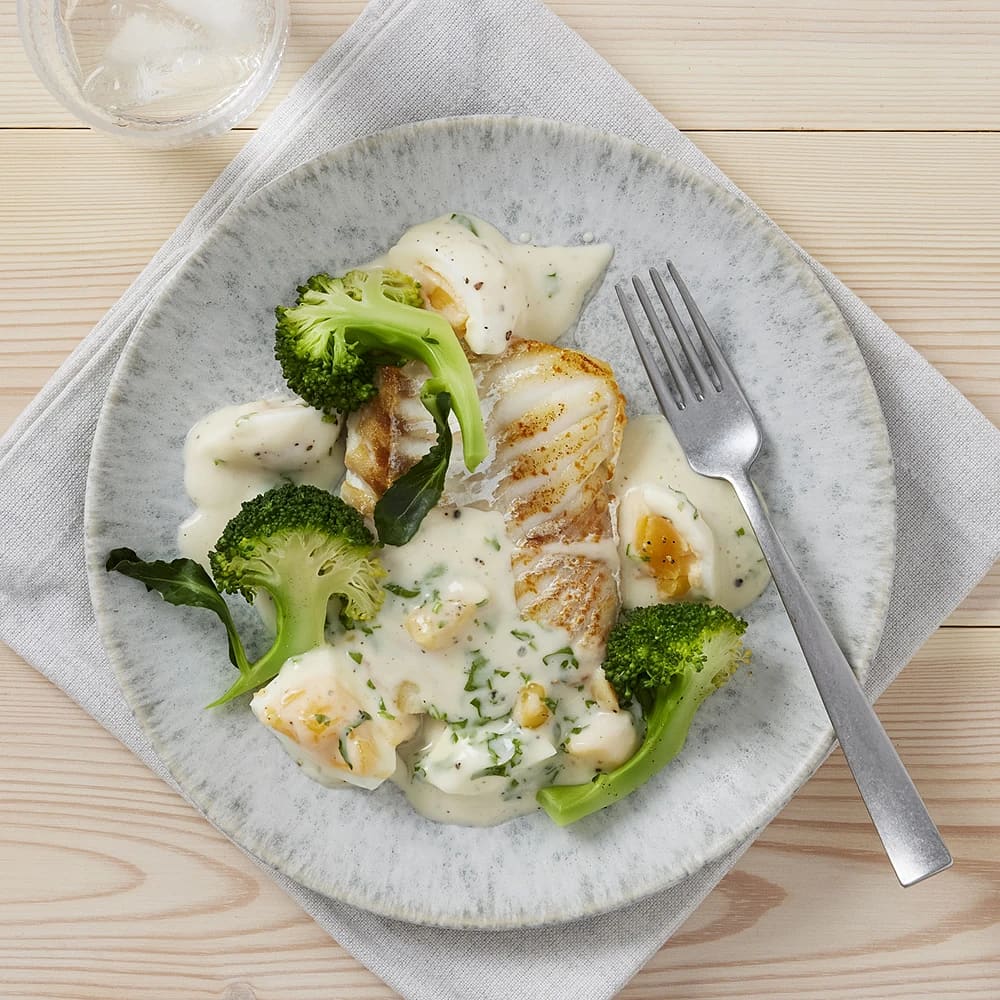 Stekt torsk med äggsås och broccoli