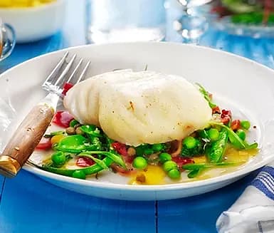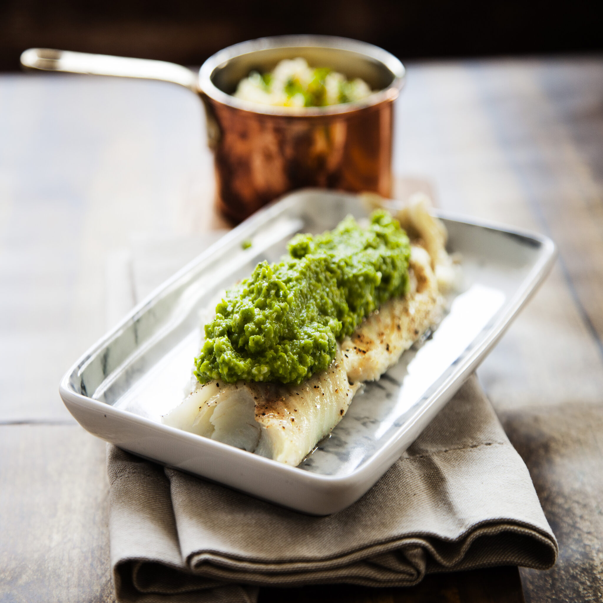 Torsk med ansjoviskräm och ljummen ärtsallad