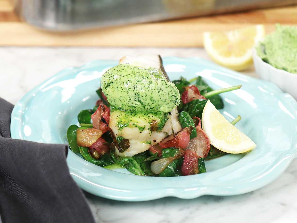 Ugnsbakad torsk med rostade rädisor och spenat- och dillsmör