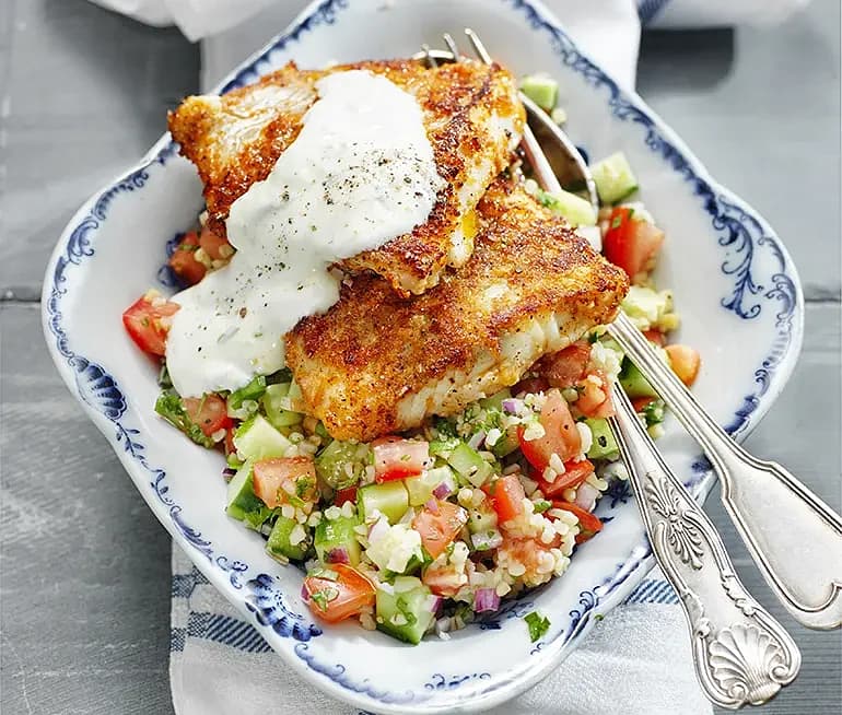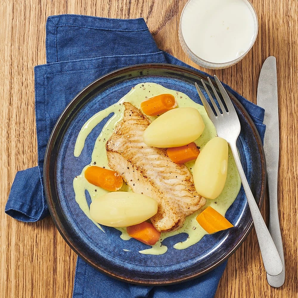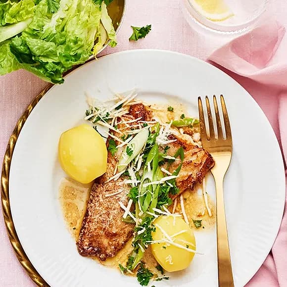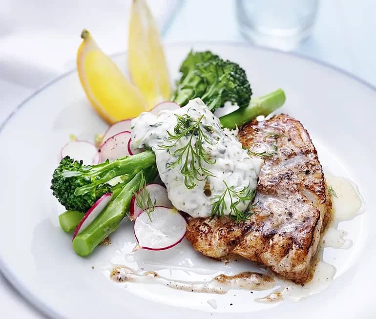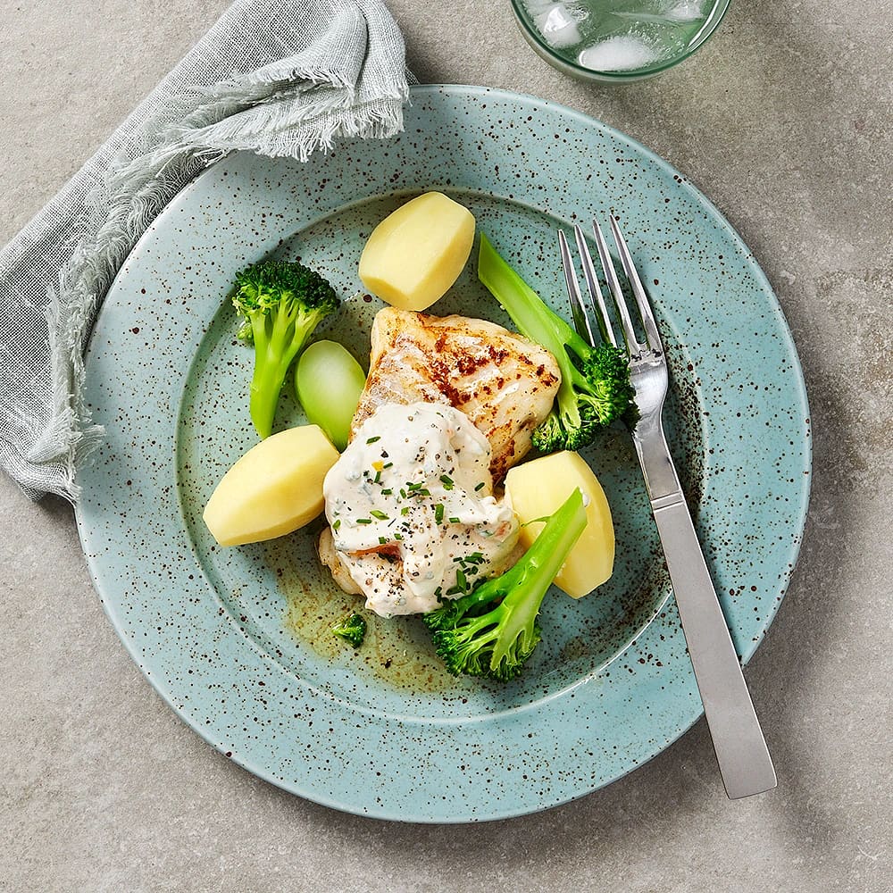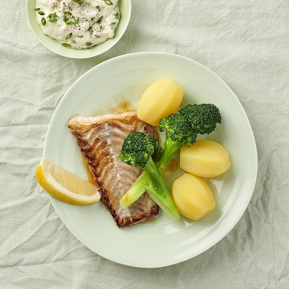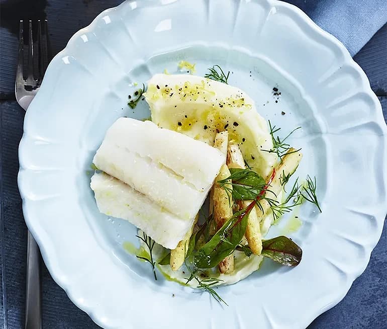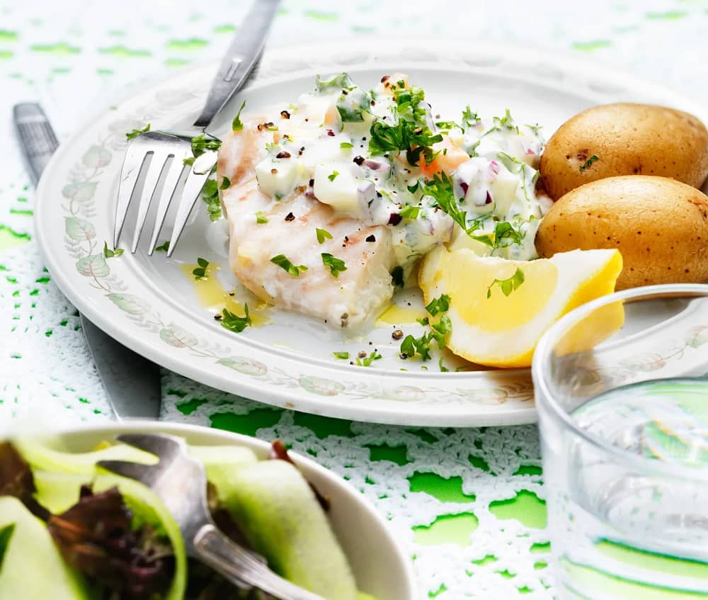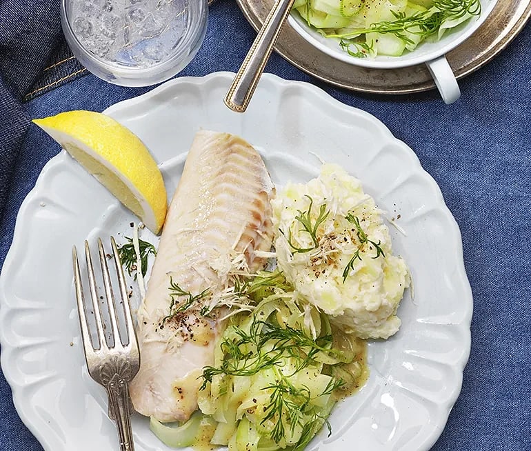 Lättrimmad torsk med dill och fänkålssallad samt gräddfilsstomp
