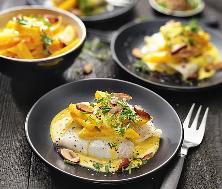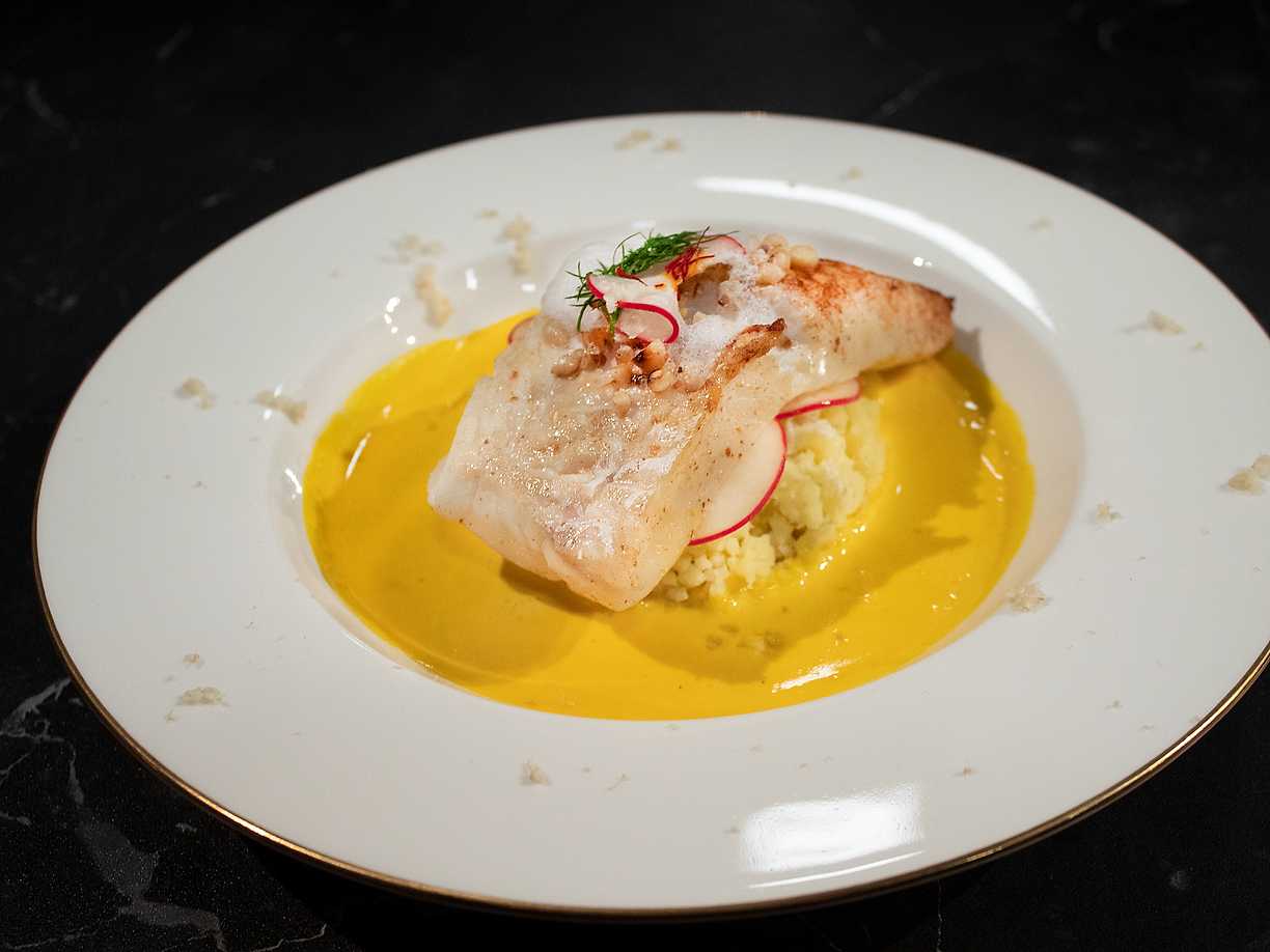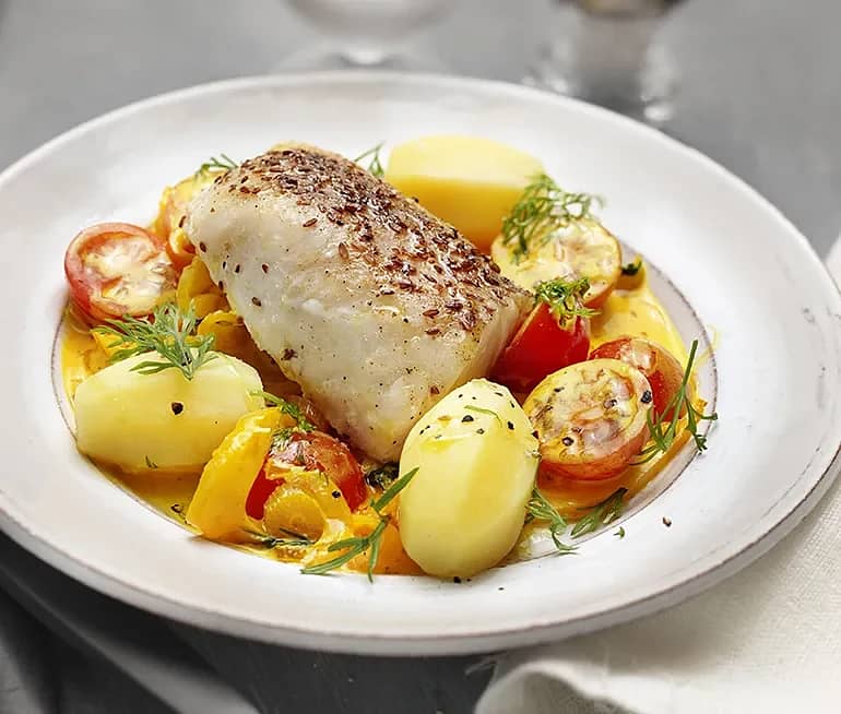 Bakad torsk med saffransinkokt fänkål och champagnesås