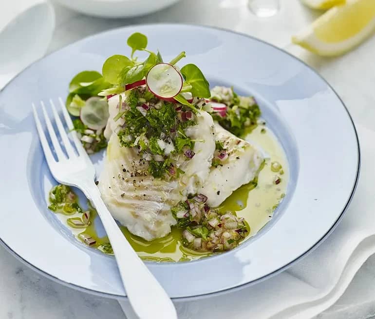 Lättrimmad torsk med beurre blanc och broccolimousse