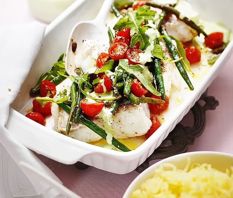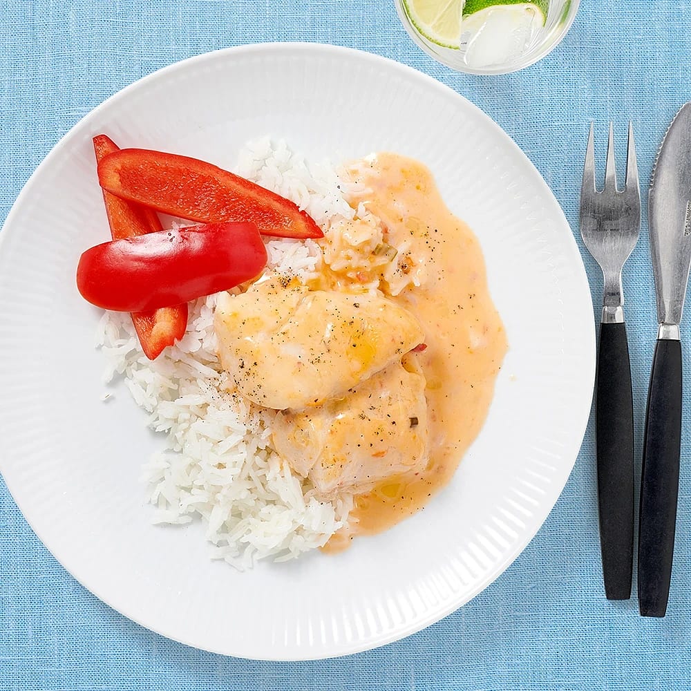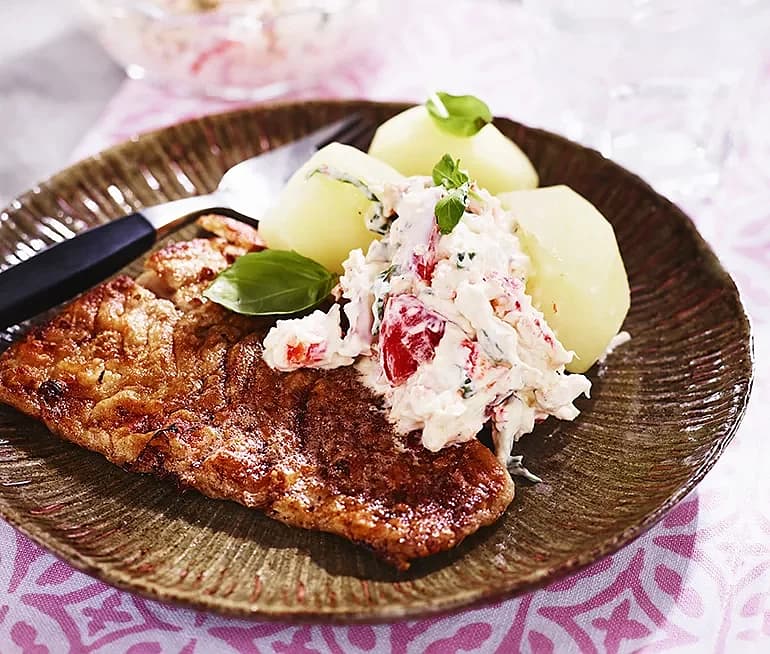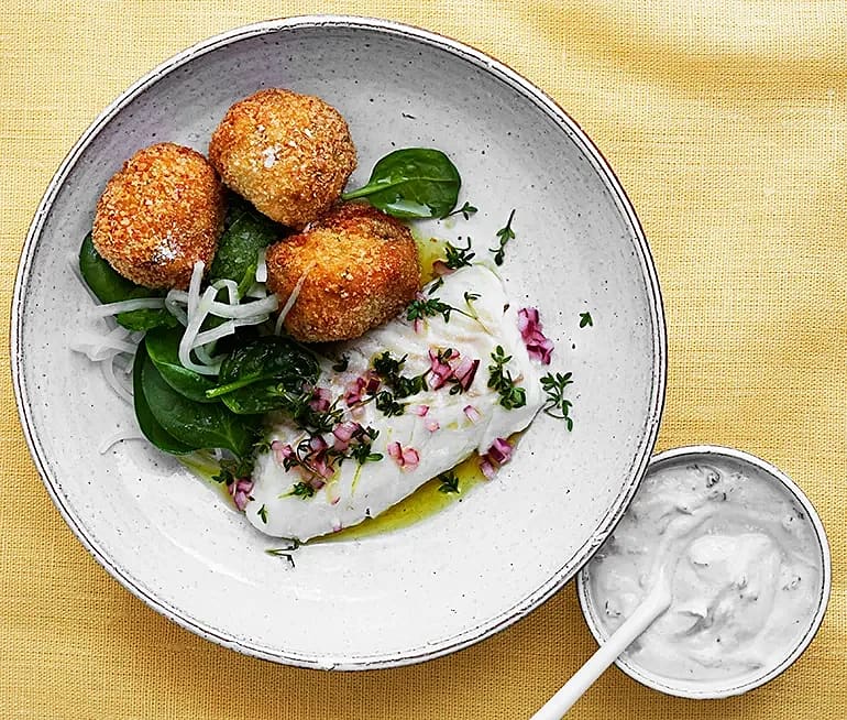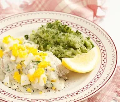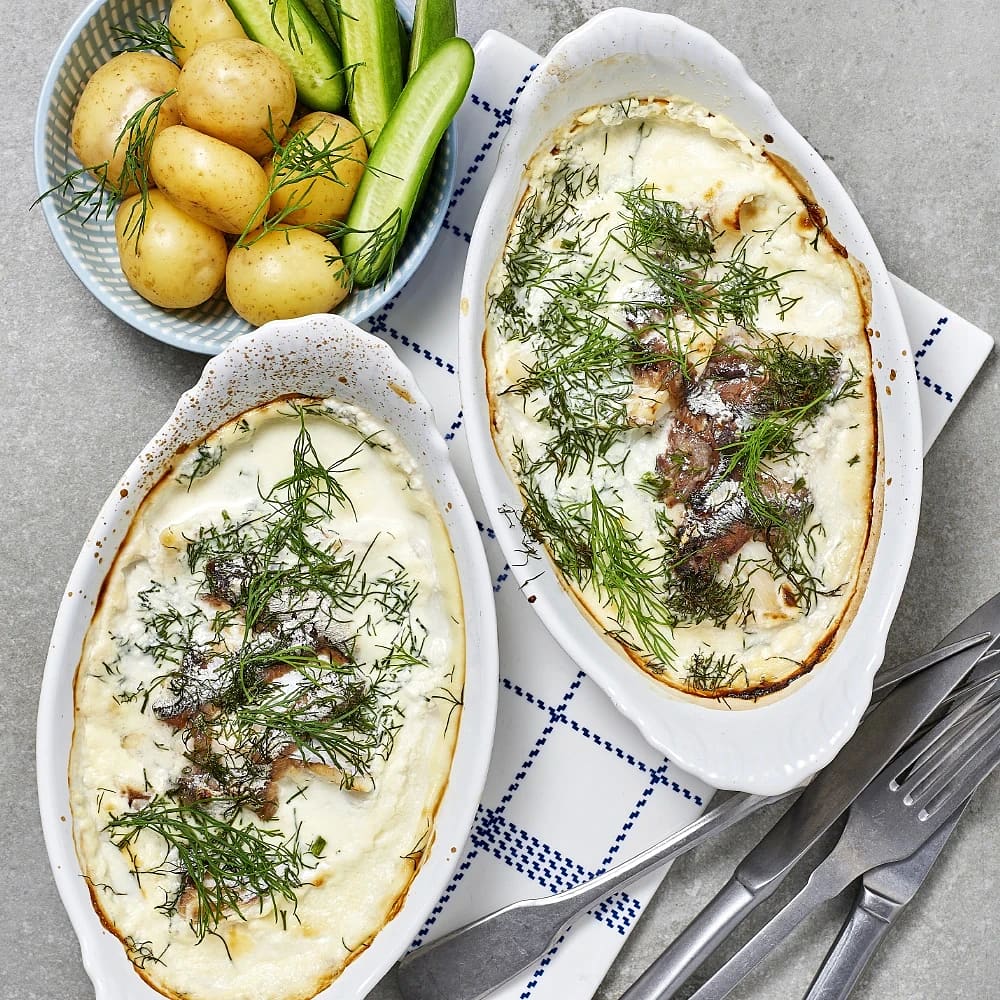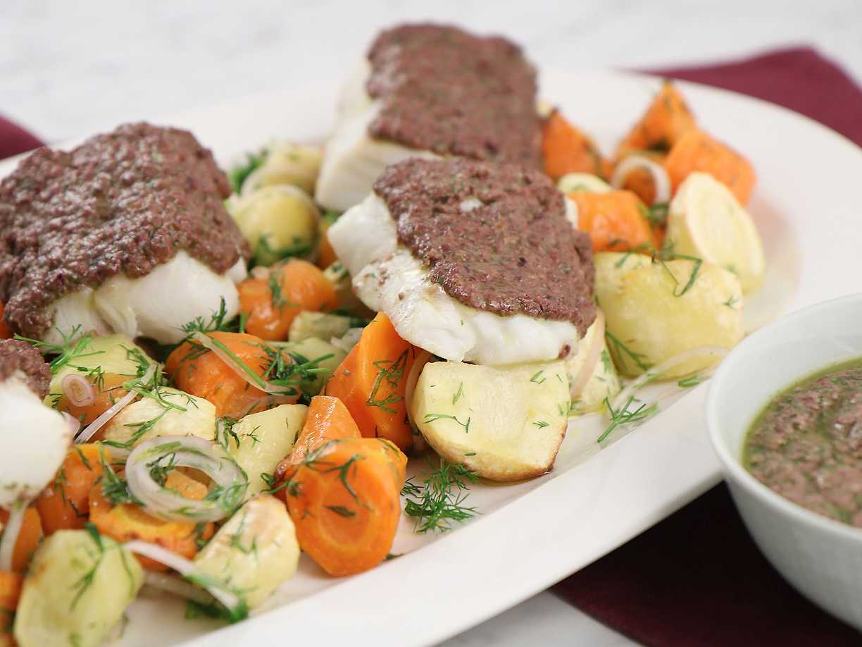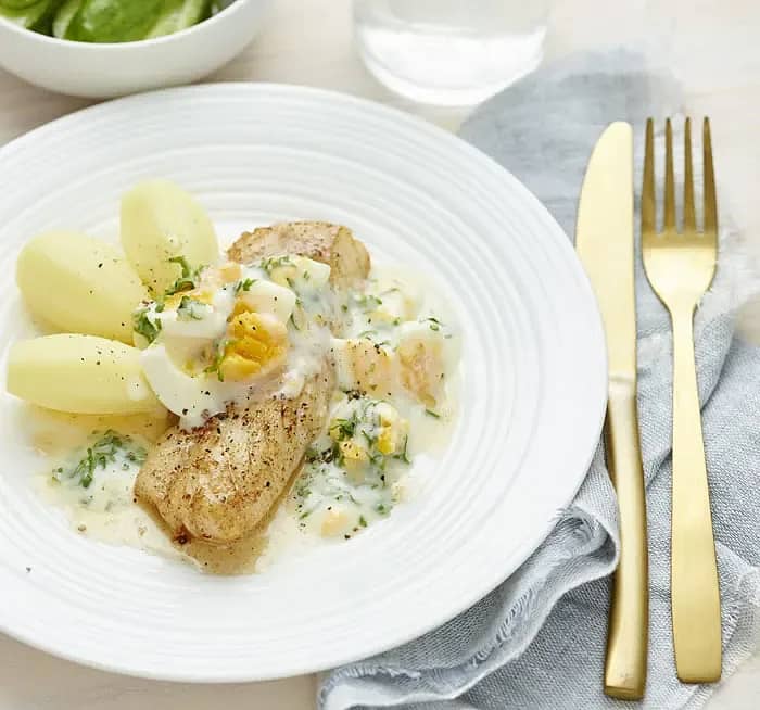 Ugnstekt torsk med ägg och rödlöksgräddfil