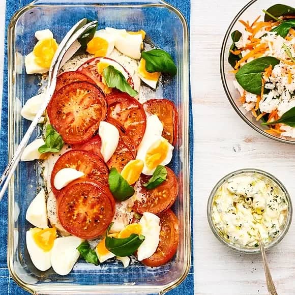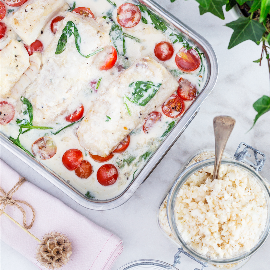 Tomatbakad torsk med spenatris, basilikasås och hackat ägg