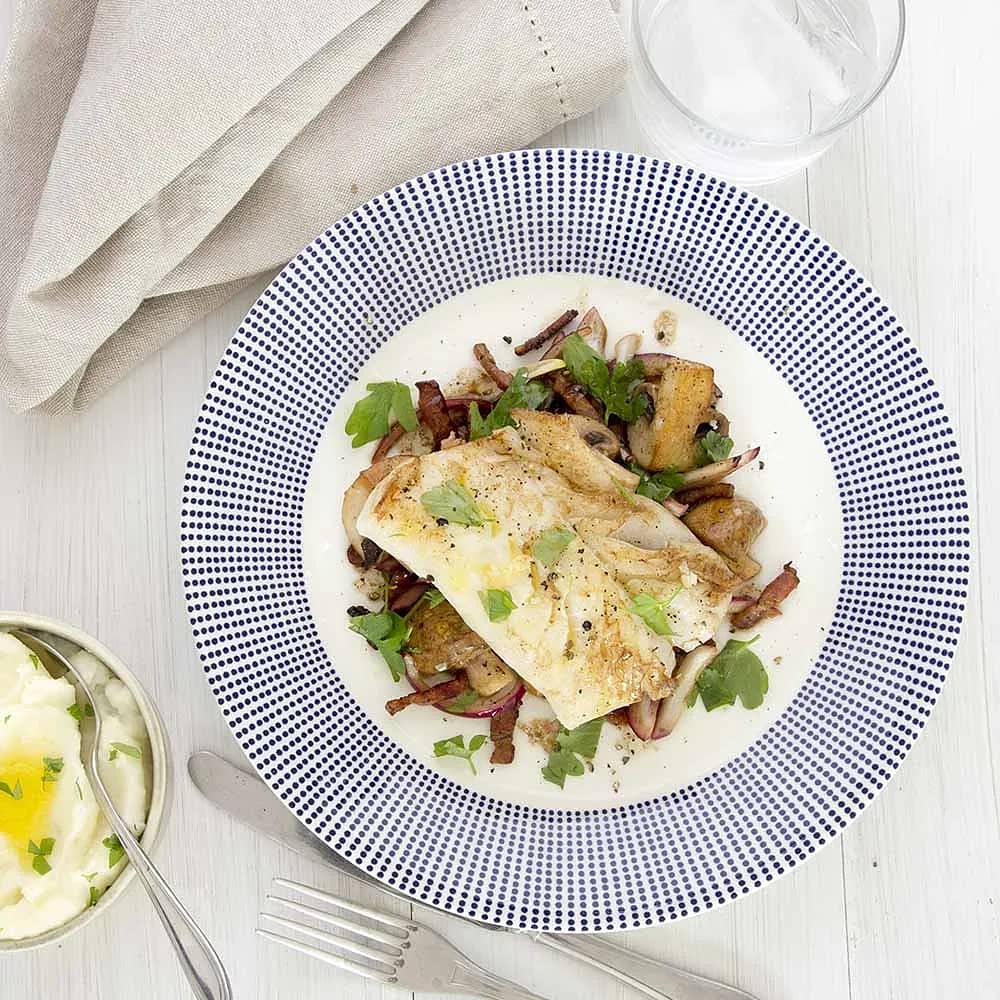 Smörstekt torsk med ragu på champinjoner och rökt sidfläsk