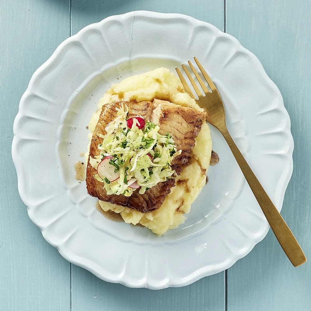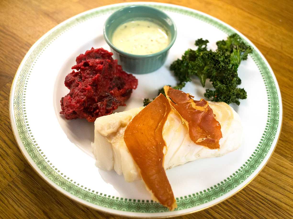 Torsk med vitlöksdoftande blomkålsmos med knaperstekt bacon