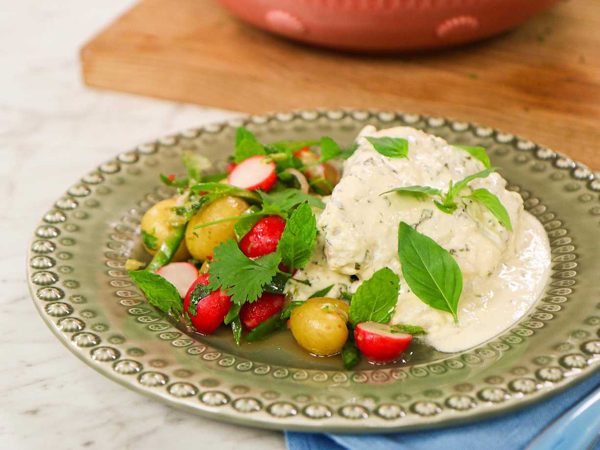 Asiatisk örtpotatis med torsk i citron-och basilikasås