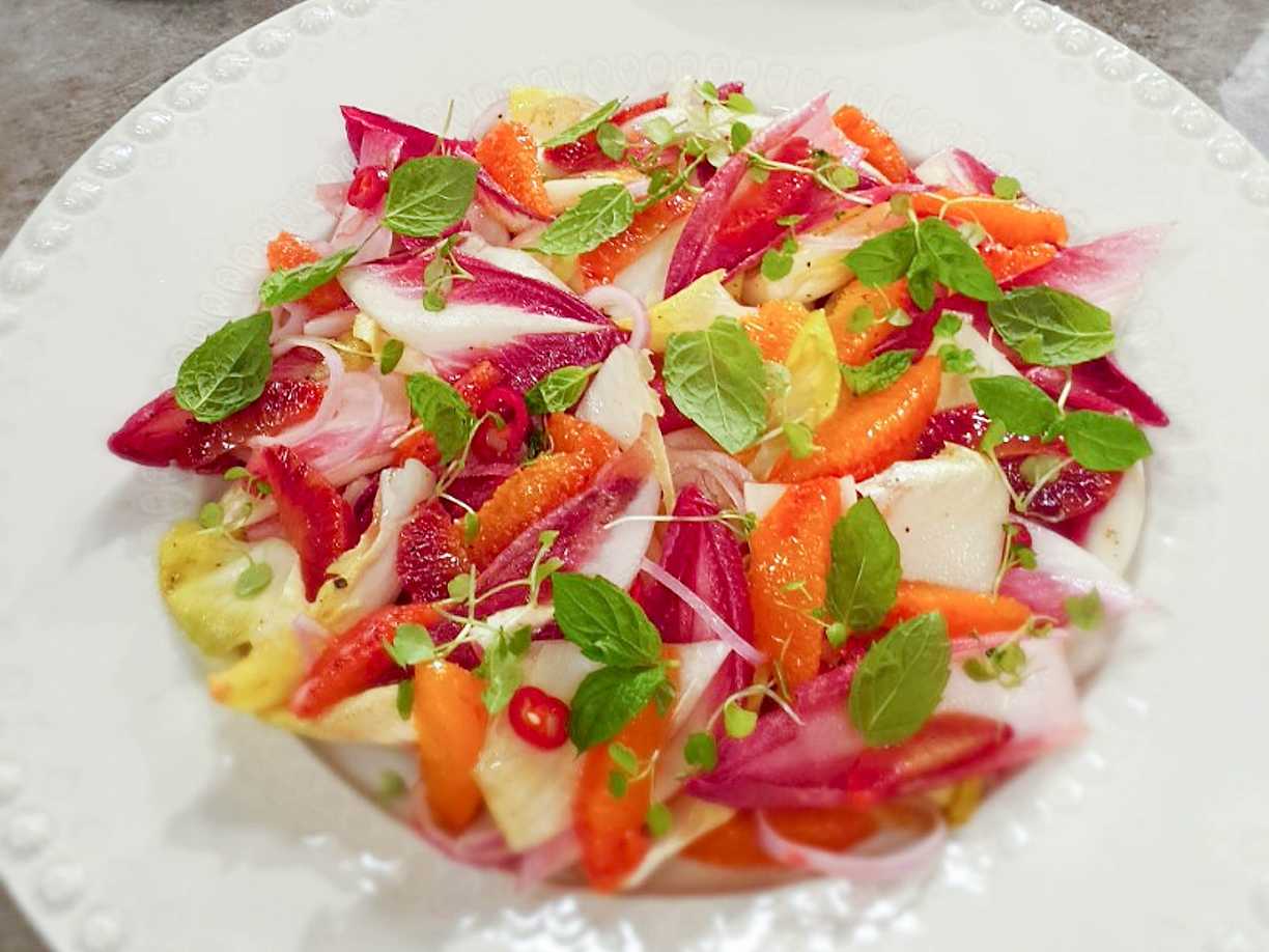 Torsk i sallad med tomatmarinad och rostade fänkålsfrön