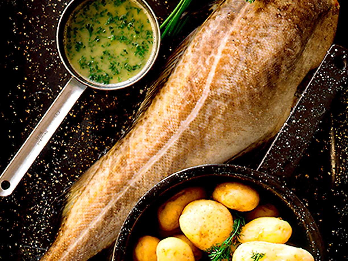 Ugnsbakad torsk med dillpotatis, brynt smör, pepparrot, ägg och räkor