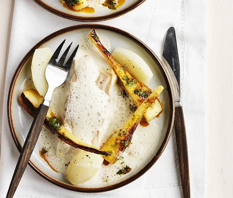 Stekt torsk med brynt palsternacka och gräslökssås