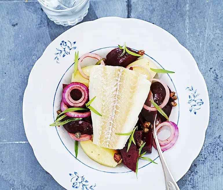 Torsk med dragon, rödbetor och brynt smör