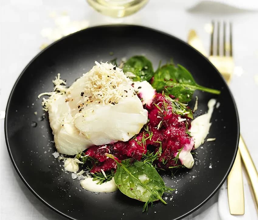 Torskrygg med rödbetskornotto