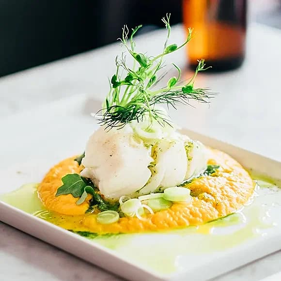 Smörstekt torskrygg med rostad blomkålspuré, hummerskum och fänkålssallad