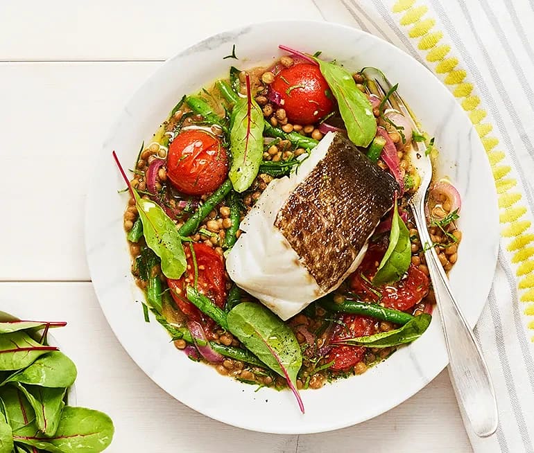 Torskrygg med linser, haricots verts, tomat och citron