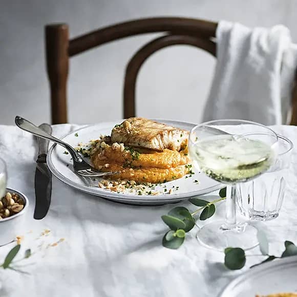 Stekt torskrygg med pumpapuré och rostade hasselnötter