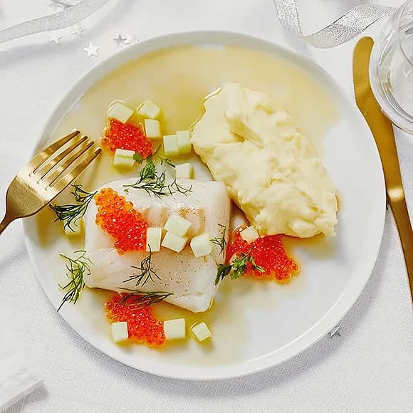 Torskrygg med champagnesås, dillolja och forellrom