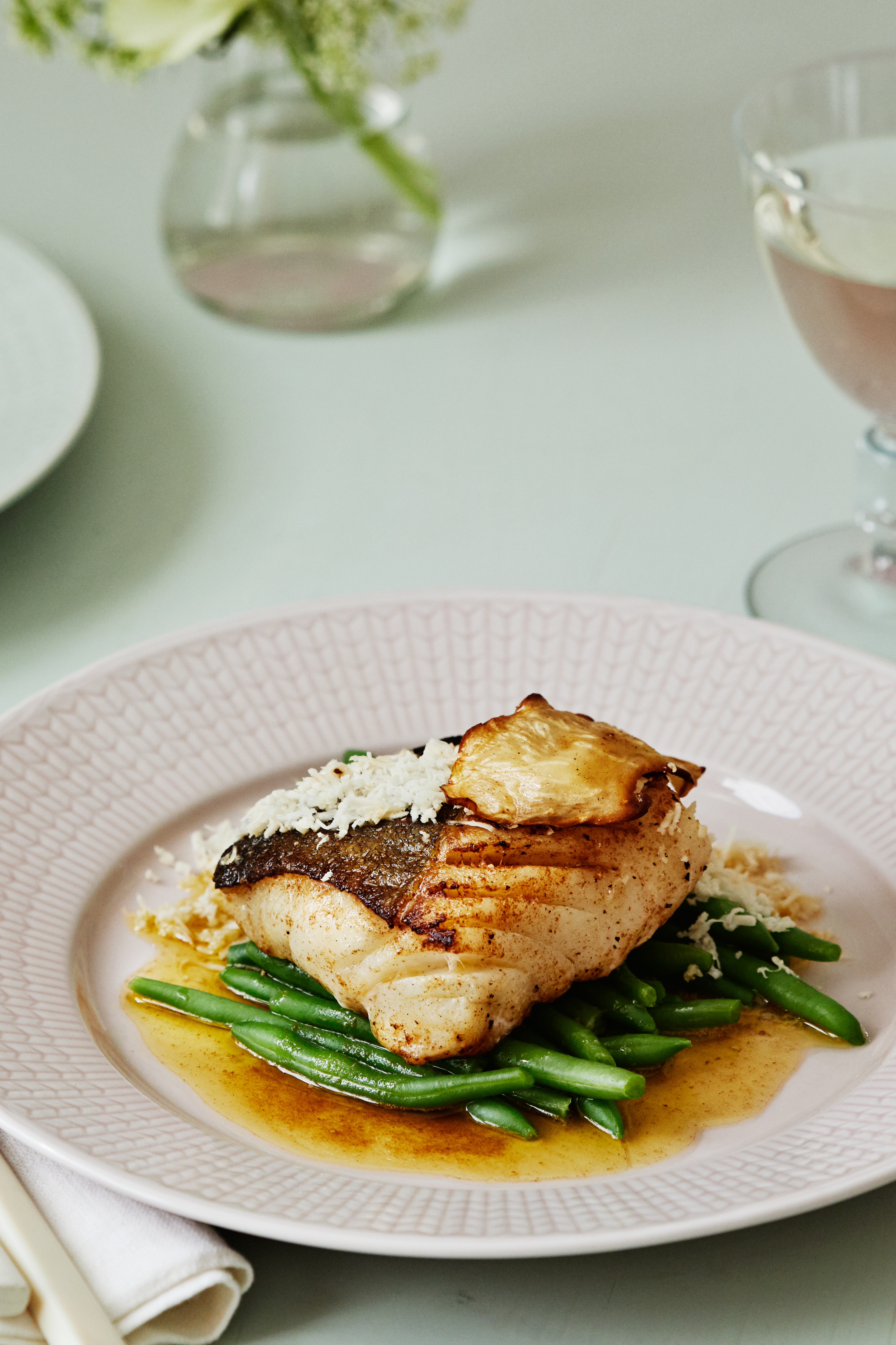 Bakad torskrygg med vitvinssås och gräslöksolja