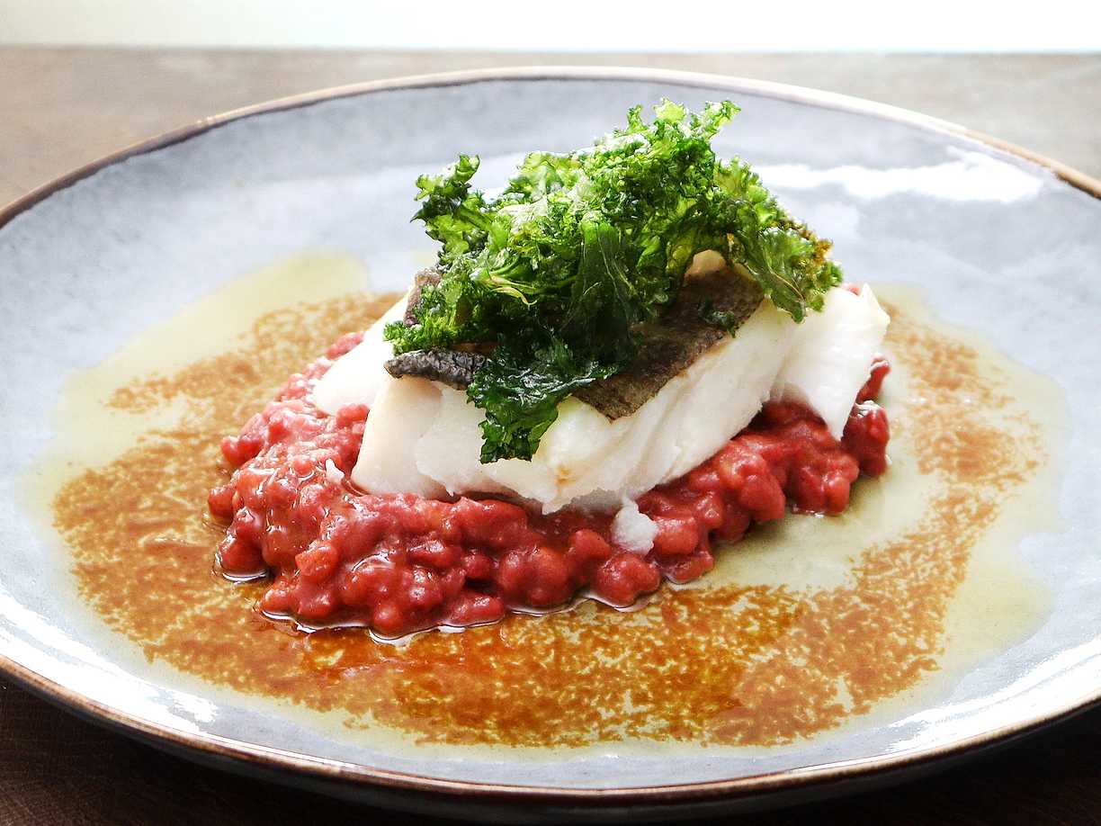 Kronärtsskocksbakad torskrygg med tomat och basilikabuljong