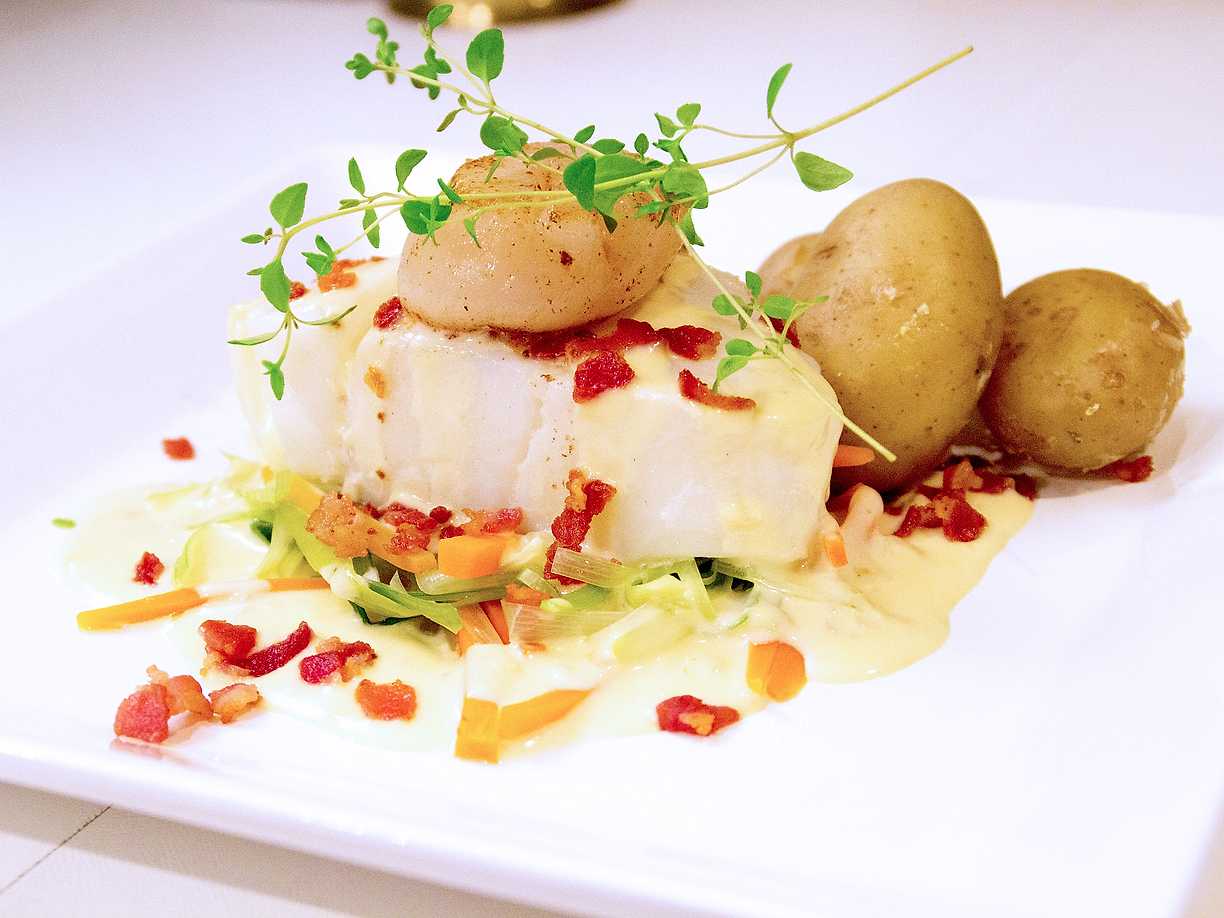 Ångad torskrygg med hummer, pilgrimsmusslor och tryffelgräddsås