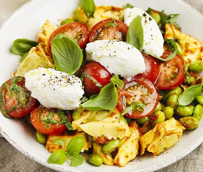 Färsk tortellini med stekta tomater, mozzarella och pecorinoost
