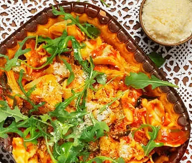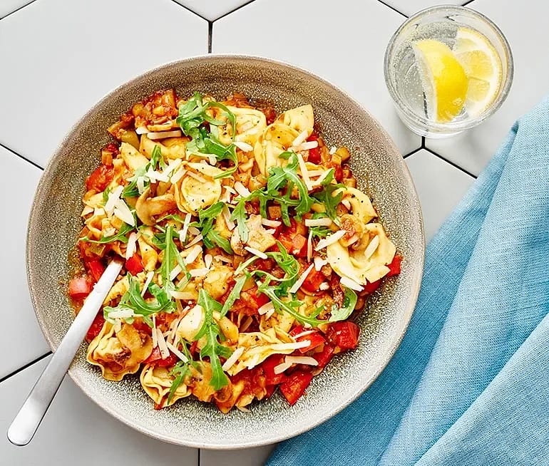 Ost- och skinkfylld tortellini med tomatsås