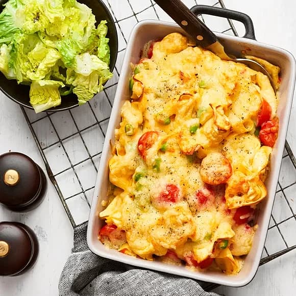 Gratinerad tortellini med kallrökt lax