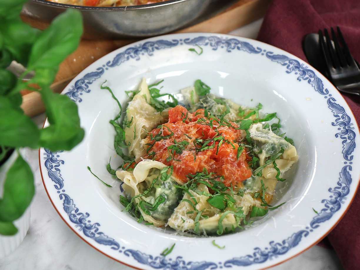 Tortellini med ricotta och basilika i tomatsås