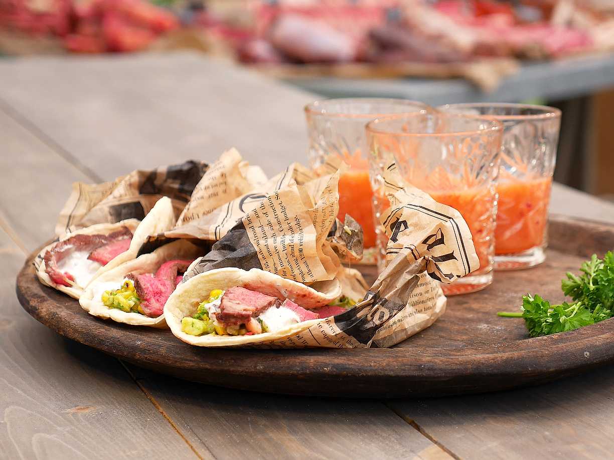 Tortilla med rödbetsbiffar och guacamole