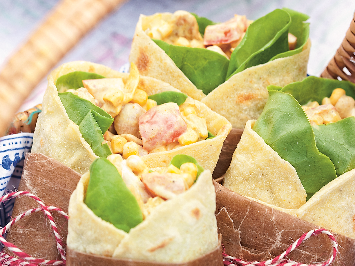 Grillad korv i tortillabröd med krämig färskpotatissallad