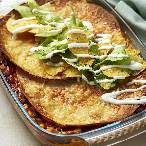 Blackbean tortillalasagne med gräddfil och nachos