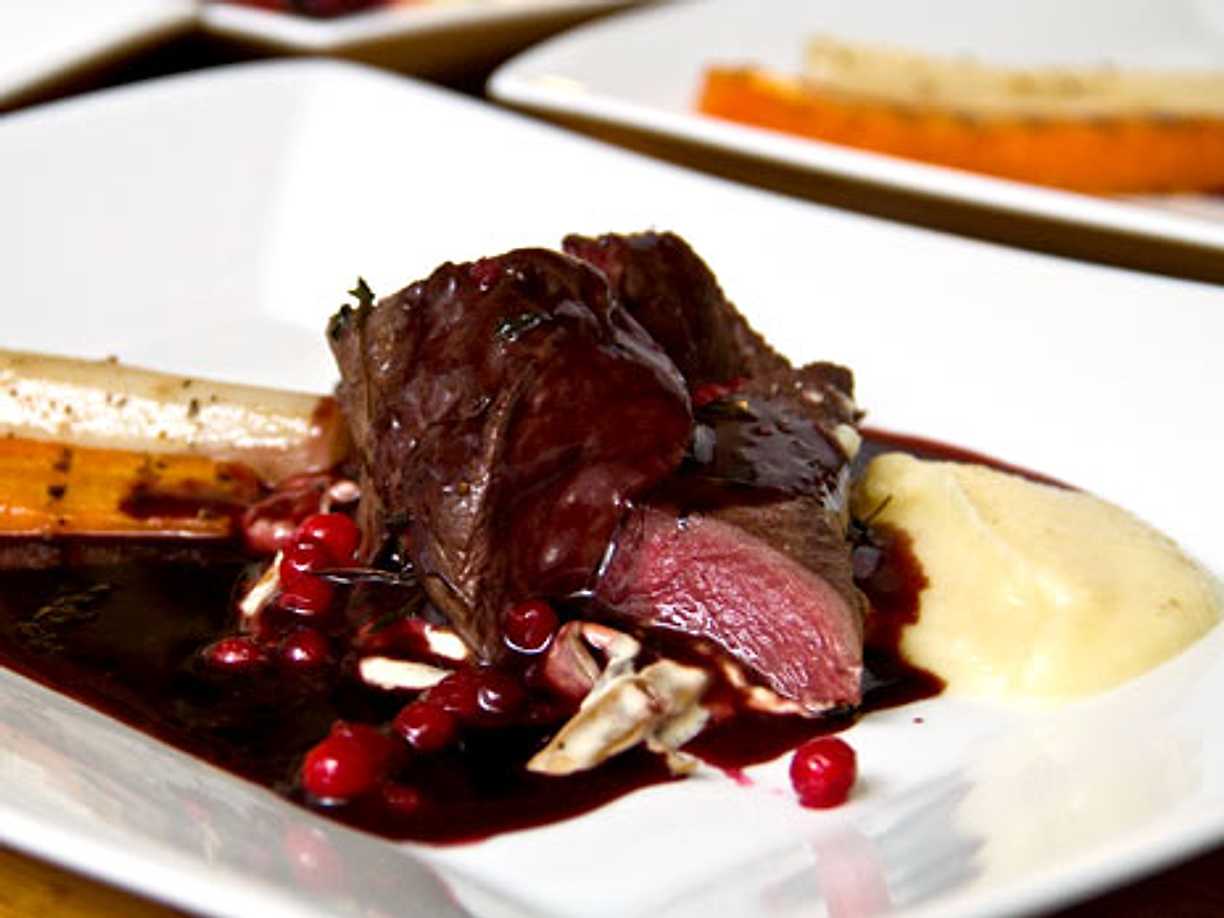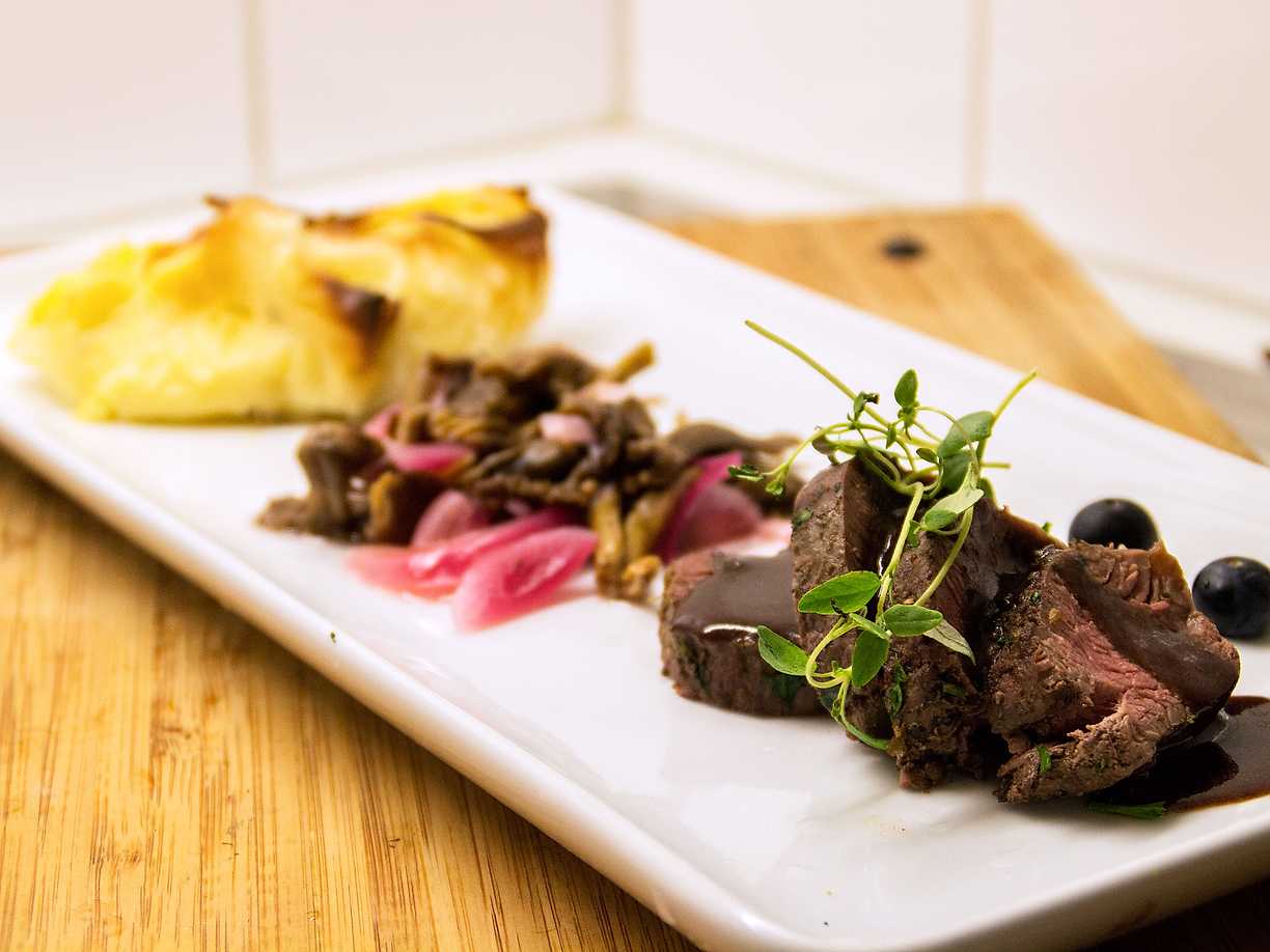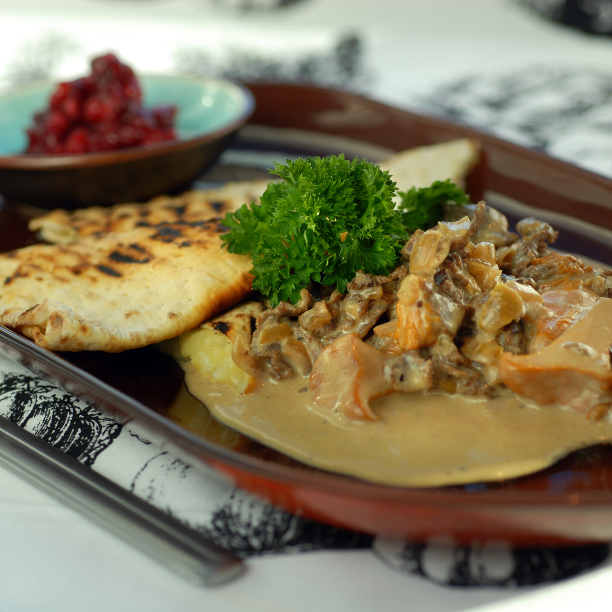 Skav med messmör och trattkantareller, mandelpotatis-quesadilla och lingonsirap