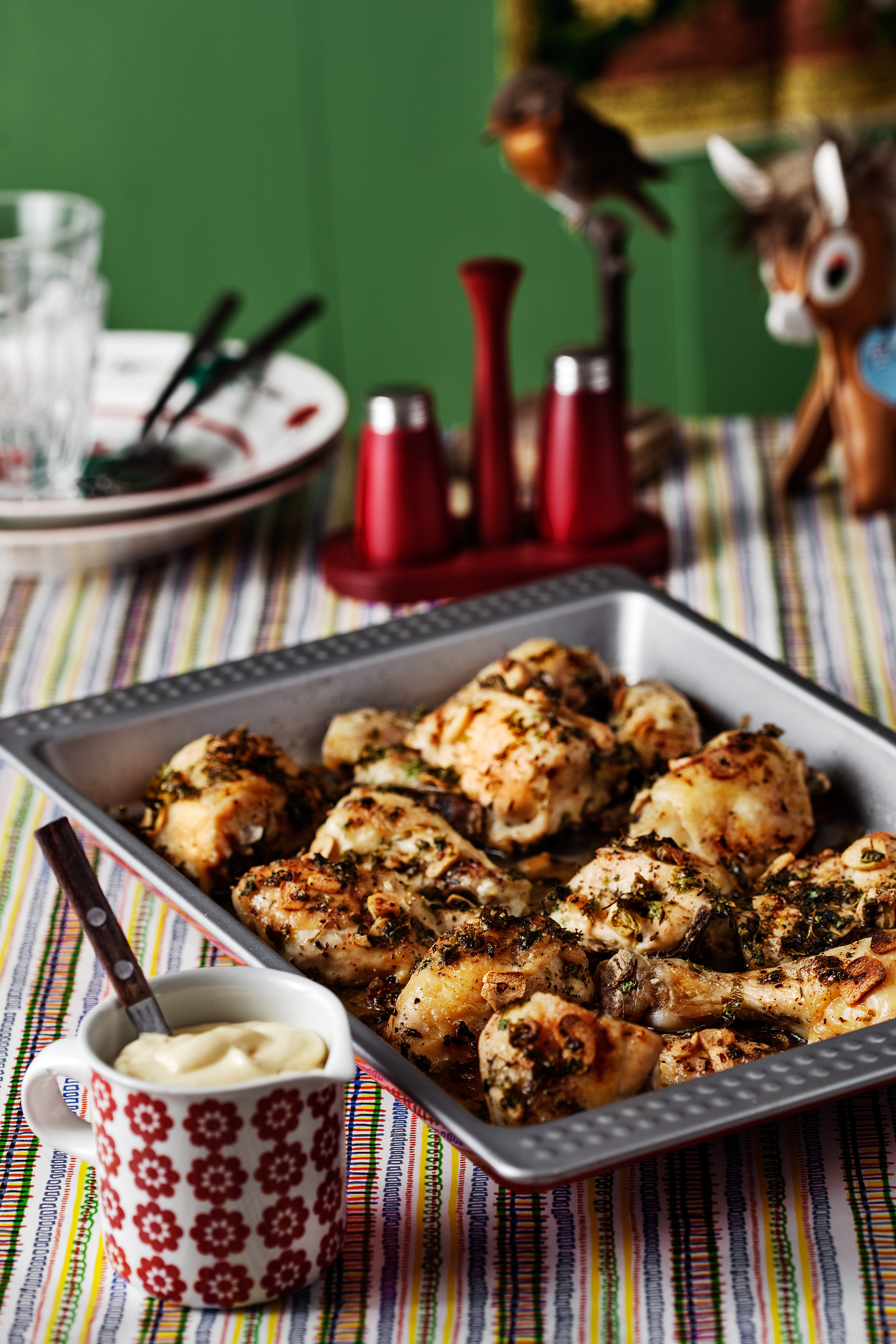 Rostas i ugn med krossad potatis och rostad vitlöksmajo