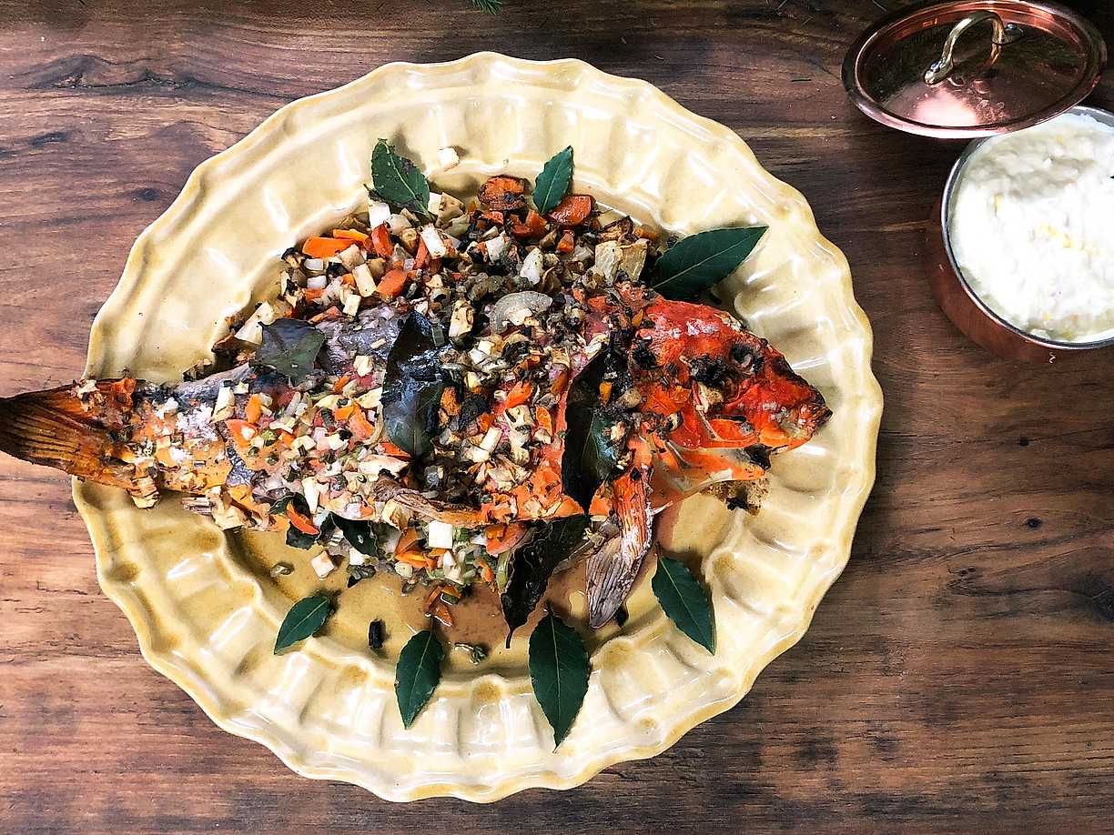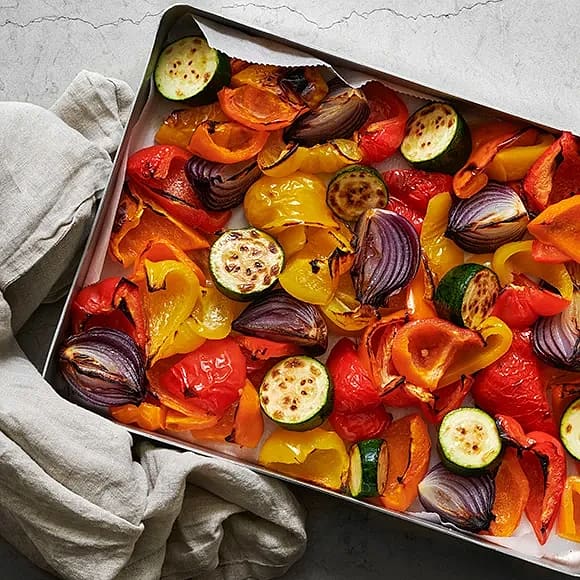 Ajvarbakad lax i ugn med basilikarostad potatis och grönsaksspagetti