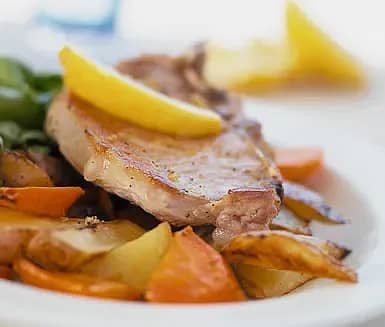 Honungsmarinerad kyckling i ugn med rotfrukter och färsk spenat