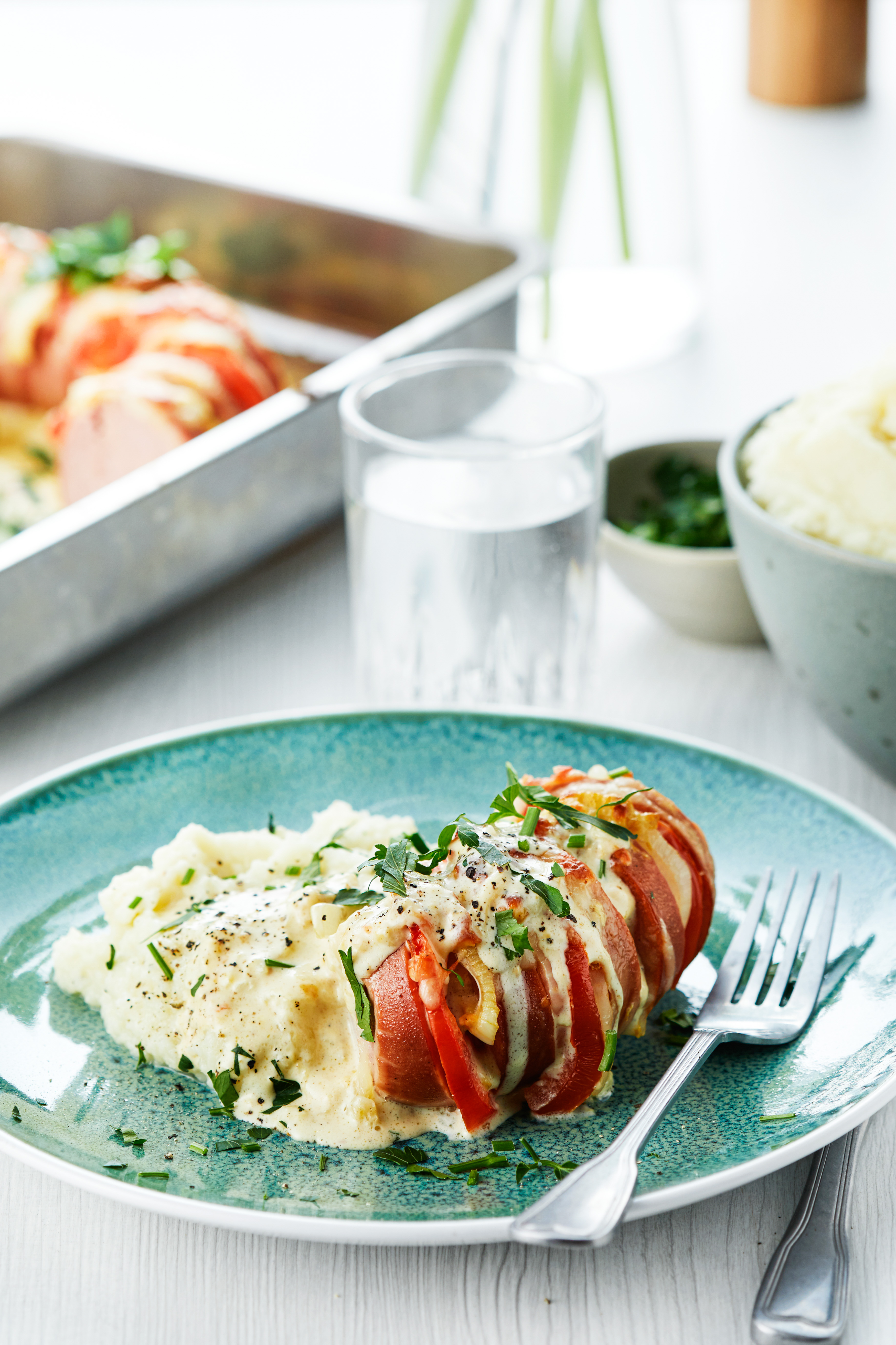 Torsk ”saltimbocca” med ugnsbakade tomater