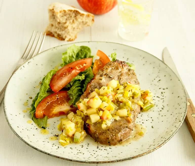 Ugnsgrillade fläskkarréskivor med äppelsalsa