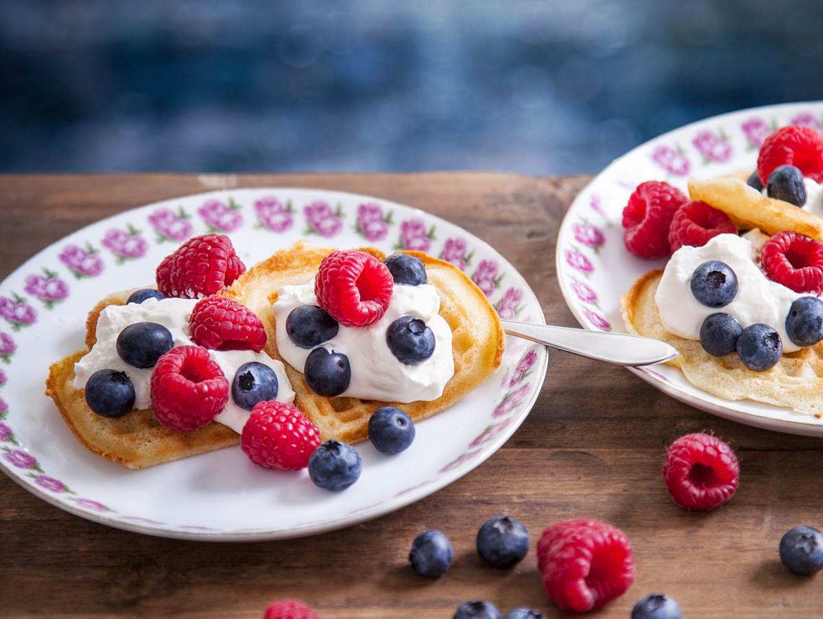 Belgiska våfflor med grädde, lönnsirap och färska bär