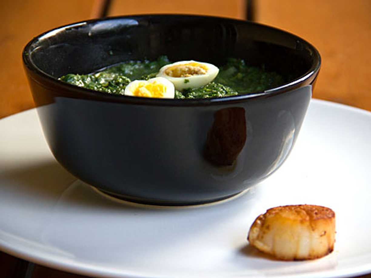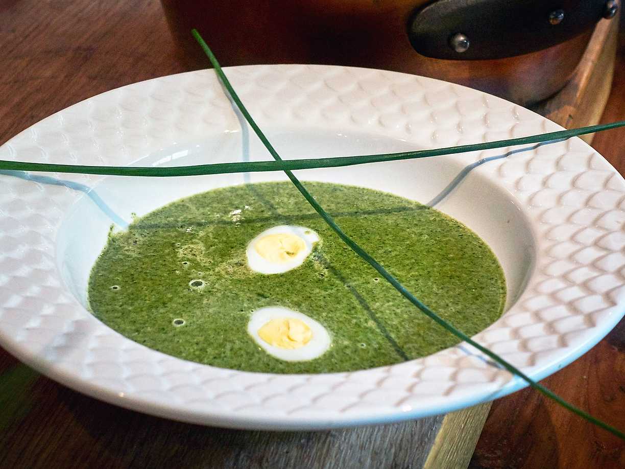Nässelsoppa med vaktelägg och pilgrimsmusslor