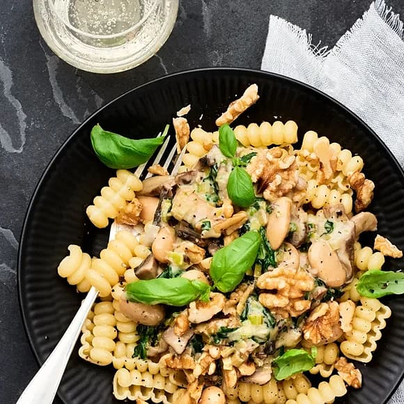 Krämig svartkålspasta med svampcrème och valnötter