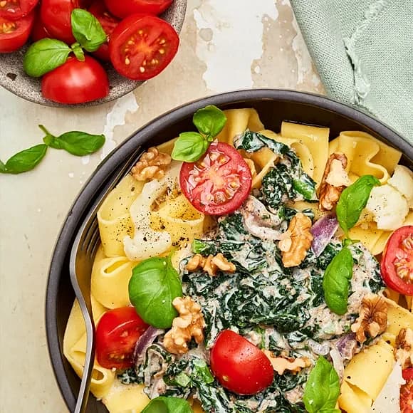 Spenatpasta med svamp och valnötter
